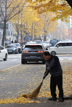 [천지일보=남승우 기자] 포근한 날씨를 보인 24일 서울 여의도역 일대 가로수길에서 작업자들이 전동 송풍기, 빗자루 등을 이용해 낙엽을 청소하고 있다.