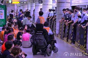 [천지일보=홍보영 기자] 전국장애인차별철폐연대(전장연)의 시위로 인해 출근길 시민 불편을 초래했던 서울 지하철 4호선 혜화역과 한성대입구역 하행선 열차의 무정차 통과 조치가 해제되고 운행이 정상화됐다.서울교통공사는 25일 오전 8시 24분경 4호선 혜화역과 한성대입구역 하행선 구간에서 특정 장애인 단체의 불법 시위로 인해 열차가 무정차 통과한다고 공지했다. 전장연은 이 시간 혜화역 승강장에서 2026년 정부 예산안에 장애인권리예산이 반영되지 않은 것에 항의하며 ‘포체투지(匍體投地, 기어가는 오체투지) 49일 차 시위’를 진행했다.