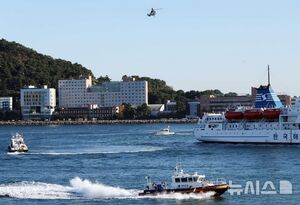 [부산=뉴시스] 여객선 화재 발생 수난대비 기본훈련이 열린 21일 부산 영도구 국립해양박물관 앞 해상에서 해경이 헬기를 동원해 부상자를 이송하고 있다. 이날 훈련에는 해경 경비함정 6척 등 함선 10척을 비롯해 헬기, 무인드론 등 장비가 동원됐으며, 부산시와 항만소방서, 해양환경공단 등 10개 기관 및 단체가 참여했다. 2025.11.21.