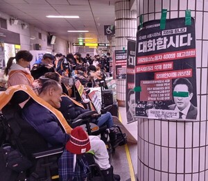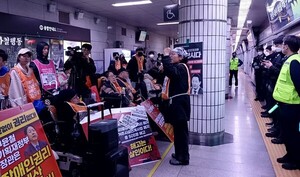 [천지일보= 배서윤 기자] 전국장애인차별철폐연대(전장연)가 25일 오후 서울 중구 시청역 승강장에서 ‘출근길 지하철 탑니다’ 시위의 연장선인 ‘12345 지하철행동’ 집회를 열고 농성하고 있다. 전장연은 오세훈 서울시장과의 대화를 요청하며 권리중심노동자 해고 철회와 장애인 탈시설, 이동권 보장 등을 촉구하고 있다.