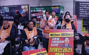 [천지일보= 배서윤 기자] 전국장애인차별철폐연대(전장연)가 25일 오후 서울 중구 시청역 승강장에서 ‘25차 12345 지하철행동’ 집회를 열고 오세훈 서울시장과의 대화를 촉구하고 있다.