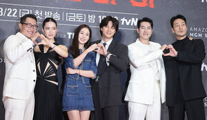 (서울=연합뉴스) 배우 대니얼 대 킴(왼쪽부터), 레이나 하디스티, 김태희, 김지훈, 션 리차드, 박해수가 18일 서울 강남구 삼성동 코엑스 메가박스에서 열린 아마존 프라임 비디오 시리즈 ‘버터플라이’ 레드카펫 행사에서 포즈를 취하고 있다.