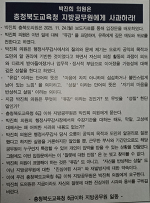 [천지일보 충북=김홍진 기자] 충북도교육청 6급 이하 지방공무원들이 25일 행정사무감사 기간에 발생한 동료 직원 사망과 관련해 박진희 충북도의원에게 공식적이고 명확한 사과를 요청했다. 직원들은 박 의원이 발표한 ‘유감 표명’만으로는 충분하지 않다는 입장을 밝혔다.이날 충북교육청에 따르면 ‘충북도교육청 6급 이하 지방공무원 일동’은 이날 성명서를 발표하고 “박진희 의원은 자신의 발언과 질의 과정에서 드러난 문제점을 돌아보고 진심 어린 사과를 전해야 한다”고 요구했다. 이들은 “유감이나 성찰이라는 표현만으로는 책임 있는 자세로 보기 어