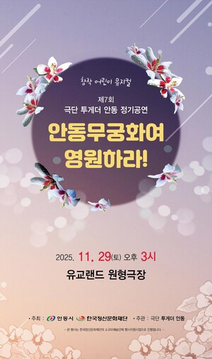 [천지일보 경북=장덕수 기자] 극단투게더안동의 창작 어린이 뮤지컬 ‘안동무궁화여 영원하라!’가 오는 29일 오후 3시 안동유교랜드 원형무대에서 공연된다.25일 안동시에 따르면 마음에서 사라져가는 안동무궁화를 되찾고 보존하려는 사람들의 이야기를 담은 이번 작품은 ‘안동역에서 피어난 사랑 꽃’ ‘제삿날 장보기’ ‘장터 이야기’ 등 다수의 작품을 소개한 송현주 작가가 극본을 맡았다. 손병국 단장이 이끄는 안동의 예술인들로 구성된 극단투게더안동이 공연을 맡았다.극단투게더안동은 2016년에 창립돼 ‘안동무궁화여 영원하라!’ 정기공연 6회와