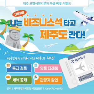 [천지일보 제주=노희주 기자] 제주특별자치도가 지난 16일부터 오는 11월 16일까지 한 달간 ‘나는 비즈니스석 타고 제주도 간다!’ 행사를 통해 고향사랑기부자에게 제주-김포 왕복 비즈니스석 항공권 등 특별한 혜택을 제공한다.이번 이벤트는 제주 고향사랑기부 활성화를 위해 기획됐으며 기부자 320명에게 다양한 경품을 지급해 참여를 독려한다.제주도는 행사기간 동안 50의 배수 순번(50, 100, … 1000)에 해당하는 기부자 20명에게 제주-김포 왕복 비즈니스석 항공권 1매를 제공한다. 또한 끝자리 3, 6, 9인 순번 기부자 30