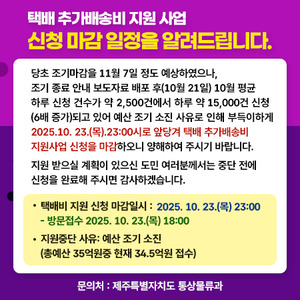 [천지일보 제주=노희주 기자] 제주특별자치도가 택배 추가배송비 지원 사업이 당초 11월 7일 종료 예정이었으나 신청 급증으로 10월 23일 오후 11시(방문 접수 오후 6시)에 조기 종료된다고 밝혔다.택배 추가배송비 지원 사업은 올해 3월부터 시행돼 지난 22일 기준 86만 건 약 34억 5000만원이 신청됐으며 총사업비 35억원의 예산이 거의 소진된 상태다.특히 지난 21일 조기 종료 예상 보도자료 배포 이후 하루 평균 신청건수가 약 2500건에서 약 1만 5000건으로 6배 증가하면서 예산 소진 속도가 빨라져 마감일이 앞당겨지게