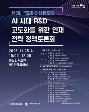 [천지일보=이재빈 기자] 국회미래연구원이 오는 25일 오전 10시 국회의원회관 제8간담회의실에서 ‘제5회 국회미래산업포럼: AI시대 R&D 고도화를 위한 인재 전략 정책토론회’를 개최한다.24일 국회미래연구원에 따르면 이번 포럼은 AI 시대 기술혁신과 글로벌 인재경쟁이 가속화되는 상황에서 국가 R&D의 질적 고도화를 위해 필요한 인재전략을 모색하기 위해 마련됐다. AI 기반 신산업 생태계에서 요구되는 핵심인재 양성·확보 방안과 국가 R&D 투자체계의 효율성 제고, 연구·교육·산업·제도의 연계 강화 등을 중심으로 국내외 정책 동향과