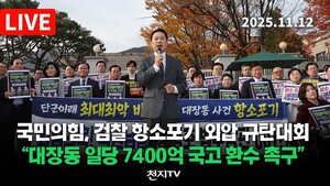 [천지일보·천지TV=김인우 기자] 국민의힘이 오늘(12일) 국회에서 ‘대장동 일당 7400억 국고 환수 촉구 및 검찰 항소포기 외압 규탄대회’를 진행합니다.국민의힘은 전국 당협위원장과 지방의원, 당원들이 참여하는 대규모 규탄대회를 열고 이번 사안을 국면 전환의 기회로 삼을 것으로 보입니다.(화면출처: 국민의힘tv)