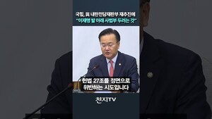 [천지일보·천지TV=김인우 기자] 국민의힘 유상범 원내운영수석부대표가 “내란전담재판부 설치는 법률이 정한 법관을 규정한 헌법 27조를 정면으로 위반하는 시도”라고 지적했습니다.유 원내수석부대표는 오늘(25일) 국회에서 열린 원내대책회의에서 “민주당이 결국 사법부의 독립을 무너뜨리고 정권 입맛에 맞는 판결을 인위적으로 찍어내는 인민재판부를 만들어 이재명과 민주당의 발 아래 두려는 본심을 실현하려 하고 있다”고 비판했습니다.그러면서 “사법부의 독립을 지켜야 한다는 더 큰 국민의 명령에는 귀를 닫는 이유는 오직 이재명을 지켜야 한다는 맹