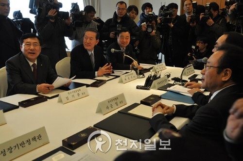 [천지일보=김지연 기자] 박재완 기획재정부 장관은 19일 서울 롯데호텔에서 경제5단체장을 만나 일자리 창출과 물가안정 등 향후 경제정책 방향을 논의했다.