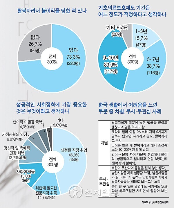 특히 경제활동을 하지 않는 주된 요인에 대해 ‘심신장애’ 때문이란 응답이 37.4%로 가장 높았다. 일을 하고 싶어도 몸이 아프고 정신적으로 힘들어 일을 하지 못하는 탈북자들이 많다는 것이다.