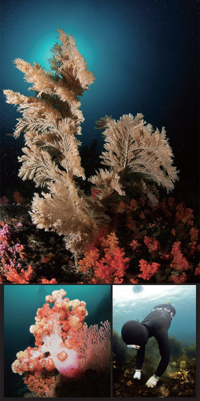 제주바다는 수온에 따라 서식하는 생물종이 다양하다. 섶섬의 경우 수많은 종류의 돌산호 군락이 4~5년 전부터 형성돼 화려함을 자랑하고 있다. 또 열대어종인 황붉돔을 비롯해 주걱치, 가시복, 범돔 등 다양한 어종이 살고 있다. 와이진은 제주의 해양생태지도를 사진으로 남겼다.