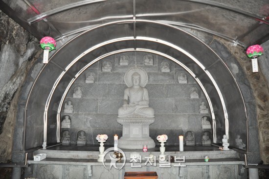 석굴암은 자연 동굴을 이용해 만든 작은 법당이다. 그 안으로는 석가여래상과 함께 주위로 반원 형태의 석조 16나한상이 봉안돼 있다. 가운데 앉아 있는 불상은 눈을 감고 있는데 경주 석굴암의 본존불을 본떠 만든 것이라고 한다.