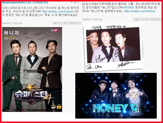 M.net ‘슈퍼스타K4’가 생방송 진출자인 그룹 허니지의 공식 포스터를 공식 트위터에 공개하면서 “최초의 콜라보 그룹~ 허니브라운+박지용의 공식이름은 ‘허니지’입니다!!! #0199로 문자 투표하실 때 꼭! ‘허니지’로 입력해주세요~”라고 문자 투표 시 조심해야 한다고 글을 남겼다.