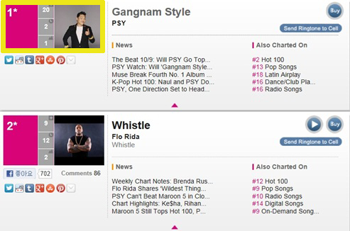 12일 미국 빌보드 닷컴에서 싸이의 강남스타일이 랩송 부문 주간 차트에서 처음으로 1위를 기록했다. 2위는 플로라이다의 ‘휘슬’, 그 뒤로 카니예 웨스트, 제이지 등이 뒤를 이었다.