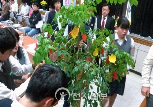 이날 교육청 직원들과 교사 및 학생들은 인권존중 방법 등에 대해 생각한 뒤 인권신장 기원 카드에 적어 인권나무에 열매를 달며 행복한 학교가 되길 기원했다.