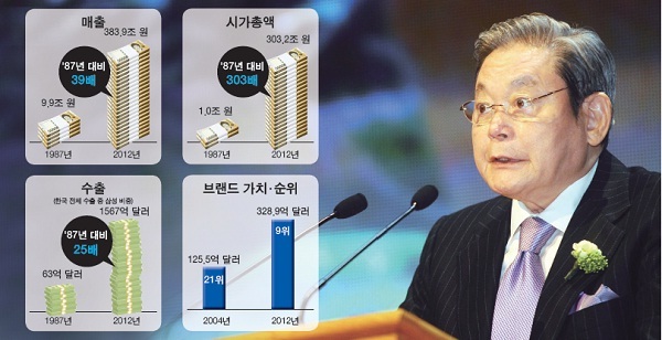 삼성그룹의 매출은 2012년 383조원을 돌파할 전망이다. 이는 1987년 이건희 회장 취임 때보다 39배 늘어난 수치다. 시가총액은 당시 1조 원에서 현재 303조 2000억 원으로 303배나 증가했다. 수출도 63억 달러에서 1567억 달러를 기록하며 25배 늘어났다.