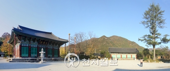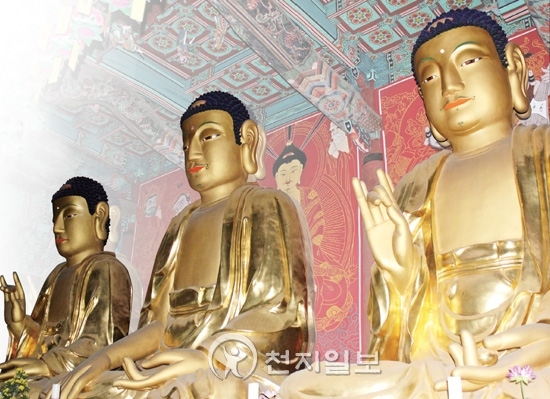 이어진 길의 끝에는 대웅전이 보인다. 이 자리에서 대웅전과 옆 첨성각, 뒤에 있는 위봉산, 나무 한 그루가 합을 이뤄 한 폭의 그림을 연상케 했다. 평소엔 대웅전 정문이 개방돼 있지 않기 때문에 대웅전 양옆에 있는 문을 통해 들어가자 엄청난 크기의 불상이 눈에 들어왔다. 석가모니, 역사여래, 아미타여래 불상(보물 제1274호)은 각각 부처의 삼세(전세‧현세‧내세)를 상징하는 삼세불이다.