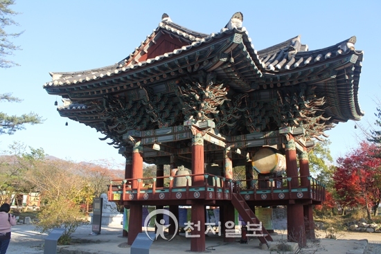 완주 송광사 또 하나의 특징은 바로 종루(鐘樓, 보물 제1244호)다. 보통 종루나 종각은 사각형인 데 비해 십자형 지붕을 갖춘 것이 특징이다. 또 이곳의 종루는 여느 사찰과 달리 무척 화려하다. 무거운 종을 품고 있는 이 종루는 누마루를 경계로 12개씩 누하주와 누상주를 세웠다. 그 위에 다포계 팔작지붕을 교차시켜 짜 올려 그 모습이 화려하다 못해 어지러울 지경이었다. 누마루의 중심을 이루는 4개의 기둥에는 하늘로 솟아오르는 듯한 용이 조각돼 있었다.