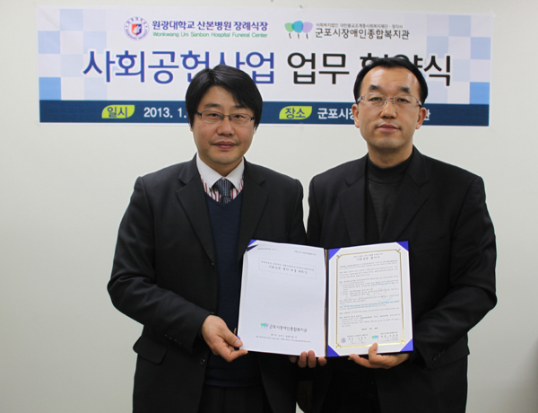 지난 25일 군포시장애인종합복지관과 원광대학교 산본병원 장례식장은 군포시장애인종합복지관 이용자와 자원봉사자, 후원자가 원광대학교 산본병원 장례식장을 이용하면 사용료 할인 등의 서비스를 제공하는 내용을 주요 골자로 하는 ‘지역사회 장애인 복지 공동체 조성을 위한 사회공헌사업 업무협약’을 체결했다.