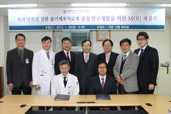 [천지일보=이길상 객원기자] 원광대학교 의과대학 산본병원(병원장 하대호)은 (주)강스템홀딩스(대표이사 강경선)와 지난 25일, 산본병원 신관 12층 회의실에서 원광대학교 의생명 강수기 부총장과 산본병원, 강스템홀딩스 임직원이 참석한 가운데 ‘줄기세포 치료제 연구개발을 위한 전략적 제휴 협약’을 체결했다고 밝혔다.