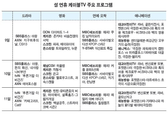 tvN, SBS플러스, AXN은 그간 놓쳤던 드라마를 몰아 볼 기회를 마련했다. SBS플러스는 연휴가 시작되는 9일부터 최신 드라마 ▲야왕 ▲돈의 화신 ▲내 사랑 나비부인을 2편씩 연속 방송한다. tvN도 10일 오후 12시 30분부터 군디컬드라마 ‘푸른거탑 더비긴즈’ 25화를 연달아 내보낸다.