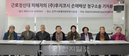 [천지일보=이솜 기자] 14일 오전 민주사회를위한변호사모임 사무실에서 태평양전쟁피해자보상추진협의회와 민족문제연구소 등이 ‘근로정신대 피해자의 (주)후지코시 손해배상 청구소송 기자회견’을 연 가운데 피해자 당사자들과 유족들이 기념촬영을 하고 있다.