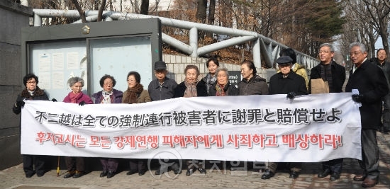 [천지일보=이솜 기자] 14일 오전 근로정신대 피해자와 유족 총 31명이 일본의 군수기업인 주식회사 후지코시를 상대로 정신적 손해액 1억 원씩을 청구하기 위해 서울중앙지방법원에 도착해 발언하고 있다.