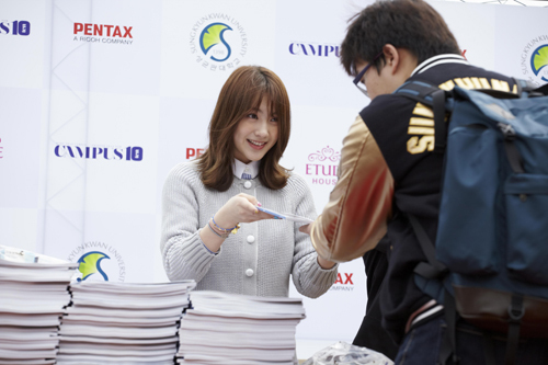오후 1시부터 시작되는 행사였지만, 이미 한 시간여 전부터 성균관대 금잔디 광장은 강지영이 직접 나눠주는 어택패키지와 그녀가 직접 표지모델을 진행한 ‘캠퍼스텐’ 4월호를 받기 위해 길게 늘어선 줄로 가득 채워져 인기를 실감케 했다.
