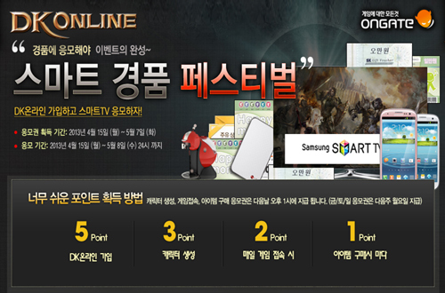 온게이트에서는 DK온라인 가입 및 캐릭생성 시 지급되는 포인트로 스마트TV, 갤럭시S4 등의 경품에 응모할 수 있는 ‘스마트 경품 페스티벌’을 내달 8일까지 진행한다. 25레벨 달성 시 100% 1만 마일리지를 제공하는 이벤트 ‘만원의 행복’, 캐쉬 아이템 10% 할인 이벤트도 마련돼 있다.