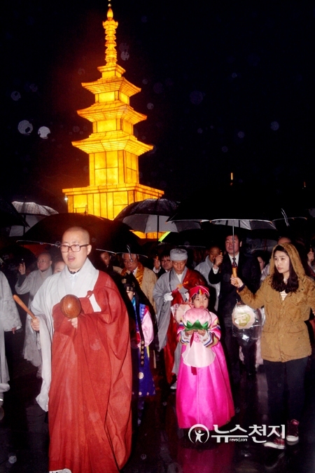 이날 행사는 봉축위원회 위원장 조계종 총무원장 자승스님을 비롯해 각 종단의 총무원장 스님과 불교계 인사 등 1천여 명이 참석한 가운데 석가탑 모양의 전통등 점등식과 한반도 평화 기원 탑돌이로 진행됐다.