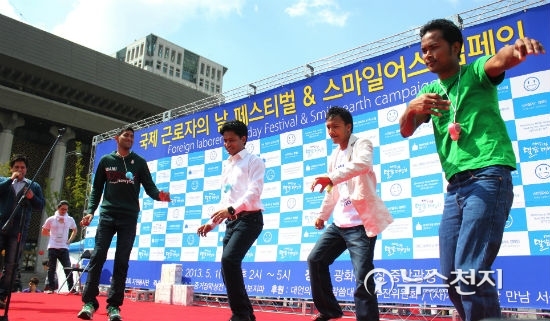 [천지일보=이솜 기자] 신천지예수교 증거장막성전(신천지) 서울야고보지파 성북교회가 1일 근로자의 날을 기념해 ‘국제 근로자 페스티벌’을 서울 광화문 광장에서 개최한 가운데 ‘외국인 노래 경연대회’에 참가한 외국인들이 노래와 춤을 선보이고 있다.
