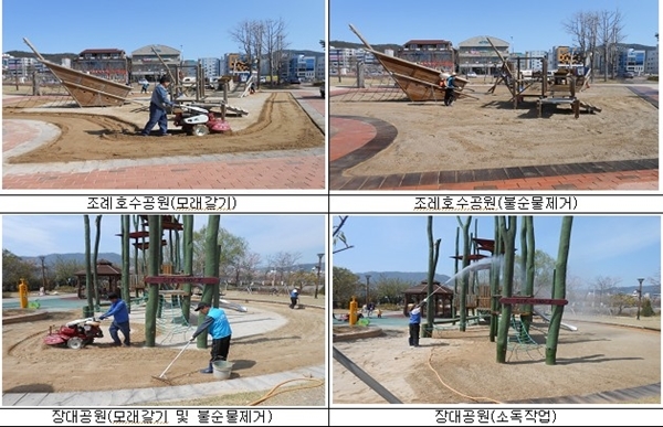 시는 5월 중순까지 1800만 원의 사업비를 들여 총 27개 어린이공원 내 놀이터 모래 소독을 완료할 계획이다.