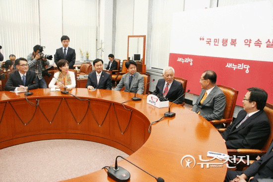 [천지일보=유영선 기자] 민주당 김한길 신임 대표가 6일 오후 서울 여의도 국회에서 새누리당 황우여 대표를 예방하고 있다.