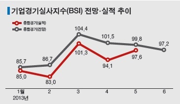 기업경기실사지수 5월 실적치도 기준선을 밑돌며 97.6을 기록했다. 전망치와 마찬가지로 2개월 연속 기준선을 하회한 것.