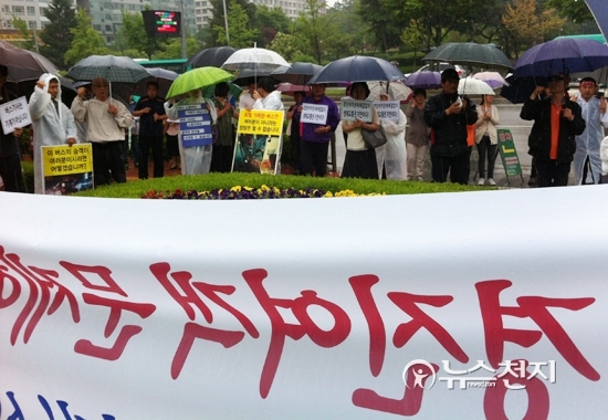 [천지일보 수원=강은주 기자] 다산인권센터와 시민단체들로 구성된 ‘경진여객 문제해결을 위한 수원시민대책위원회’는 지난 27일 오후 수원시청 앞에서 경진여객 사태해결을 촉구하는 집회를 열었다.