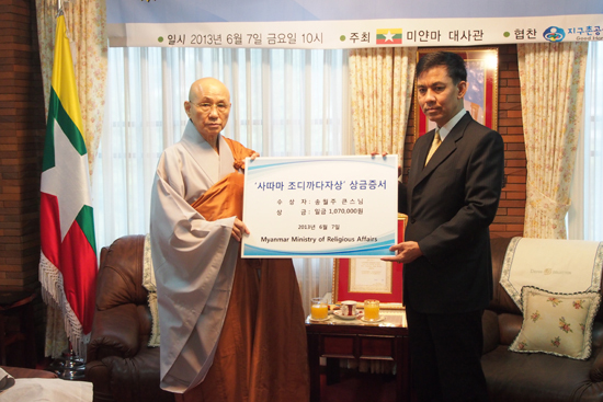 미얀마 종교부(Ministry of Religious Affairs)가 추대하고 미얀마 대통령이 수여하는 송월주 큰스님 사따마 조디까다자(Saddhamma Jotikadhaja) 작위 수훈식이 7일 서울 용산구 한남동 주한 미얀마대사관에서 진행됐다. 사따마 조디까다자 작위는 부처님의 가르침을 빛나게 하는 분이라는 뜻의 팔리어로 미얀마 종교부가 수여하는 작위 중 가장 높은 작위로 알려졌다.