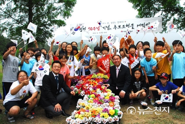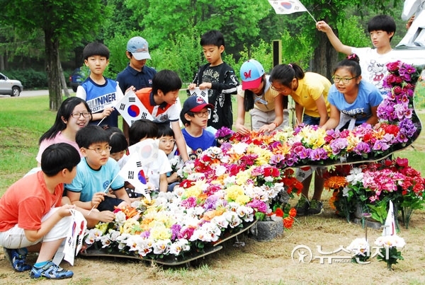 13일 대전현충원은 올해 ‘정전 60주년’과 ‘호국보훈의 달’을 맞아 특별히 기획된 ‘폐조화를 활용한 나라사랑 추모조형물 제막식’ 행사를 사병 제1묘역 입구에서 개최했다.