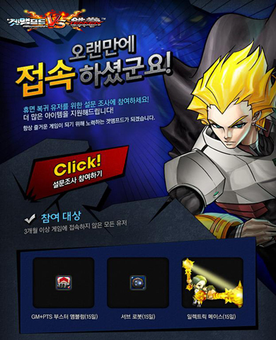 [천지일보=김현진 기자] 윈디소프트(대표이사 백칠현)가 서비스하는 온라인 대전액션 게임 ‘겟앰프드’ ‘겟앰프드2’에서 ‘휴면 설문 조사 이벤트’를 진행한다.