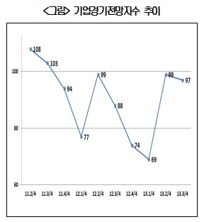 BSI는 100 미만이면 다음 분기 경기가 이번 분기보다 나빠질 것으로 보는 기업이 더 많은 것이고, 100을 넘어서면 그 반대다.