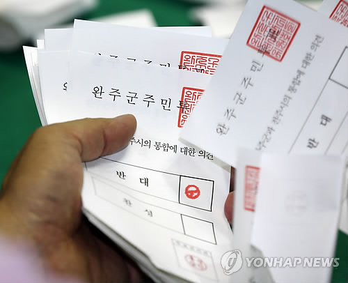 27일 완주군 선거관리위원회에 따르면 지난 26일 실시한 완주군 주민투표(사전투표 포함) 결과 반대 55%, 찬성 44.4%, 무효 0.4%로 집계됐다.