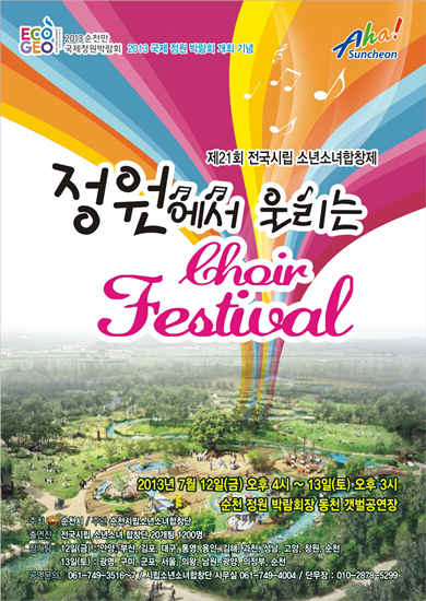 [천지일보=김미정 기자] ‘제21회 전국시립소년소녀합창제’가 오는 12일과 13일 양일간 2013순천만국제정원박람회장 동천갯벌공연장에서 ‘정원에서 울리는 힐링 페스티벌’을 주제로 열린다.