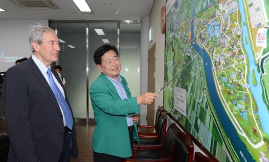 [천지일보=김미정 기자] 프랑스 시장 협회 회장이자 롱르 르 소니에(롱스) 시 시장인 쟈크 펠리사르(Jacques PELISSARD)회장이 2일 순천만국제정원박람회장을 방문했다.