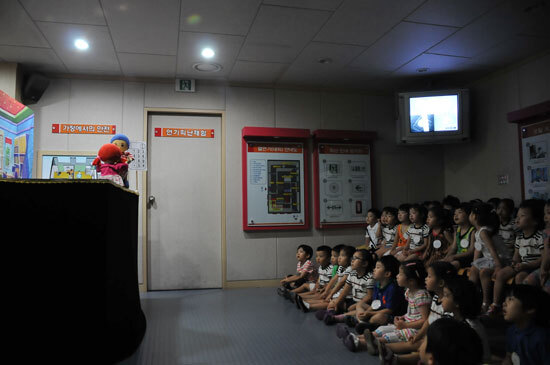 이날 교육은 119신고 요령과 대처방법 등을 어린이들이 쉽게 배울 수 있도록 하기 위해 소방관들이 직접 인형극을 진행했다.