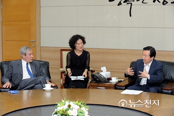[천지일보 광주=이지수 기자] 강운태 광주시장은 3일 광주를 방문한 프랑스 롱스시의 자크 펠리사르 시장과 만나 광주비엔날레 등 광주시의 문화시책 등을 설명했다.