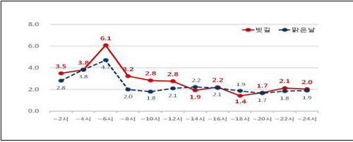 맑은 날에 비해 빗길교통사고의 치사율이 높았으며 특히 오전 4~6시 사이가 가장 치사율이 높은 것으로 나타났다.