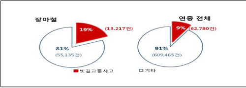 장마철 기간 동안 빗길교통사고는 약 19%(1만 3217건)로 연중 빗길교통사고 구성비(9%)보다 2.1배 높아, 장마철 기간의 빗길교통사고가 평소의 두 배 이상 빈번하게 발생한 것으로 나타났다.