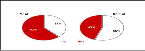 장마철 기간 맑은 날 교통사고는 주간(55%)이 야간(45%)보다 많았던 반면, 빗길교통사고는 주간(38%)보다 야간(62%)이 많았다.