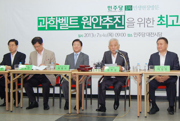 김한길 민주당 대표는 이날 “국제과학비즈니스벨트라는 대형 국책사업이 갑자기 엉뚱한 방향으로 흘러가고 있기 때문에 이것을 바로 잡아야한다”면서 “대한민국 과학기술 발전에 초석이 될 사업인 국제과학비지니스벨트 터는 반드시 당초 계획대로 추진돼야 한다”고 강조했다.