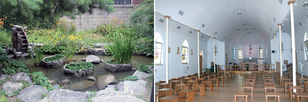 성당을 나와 오른쪽으로 작게 나 있는 길은 신자들이 묵주를 들고 기도를 할 수 있는 ‘십자가 길’이다. 여름을 맞은 각종 나무로 푸르게 장식돼 있는 이 길을 걷고 있으면 정원에 온 듯한 느낌이 든다. 이 길의 끝은 물레방아가 있는 작은 연못이 나온다.